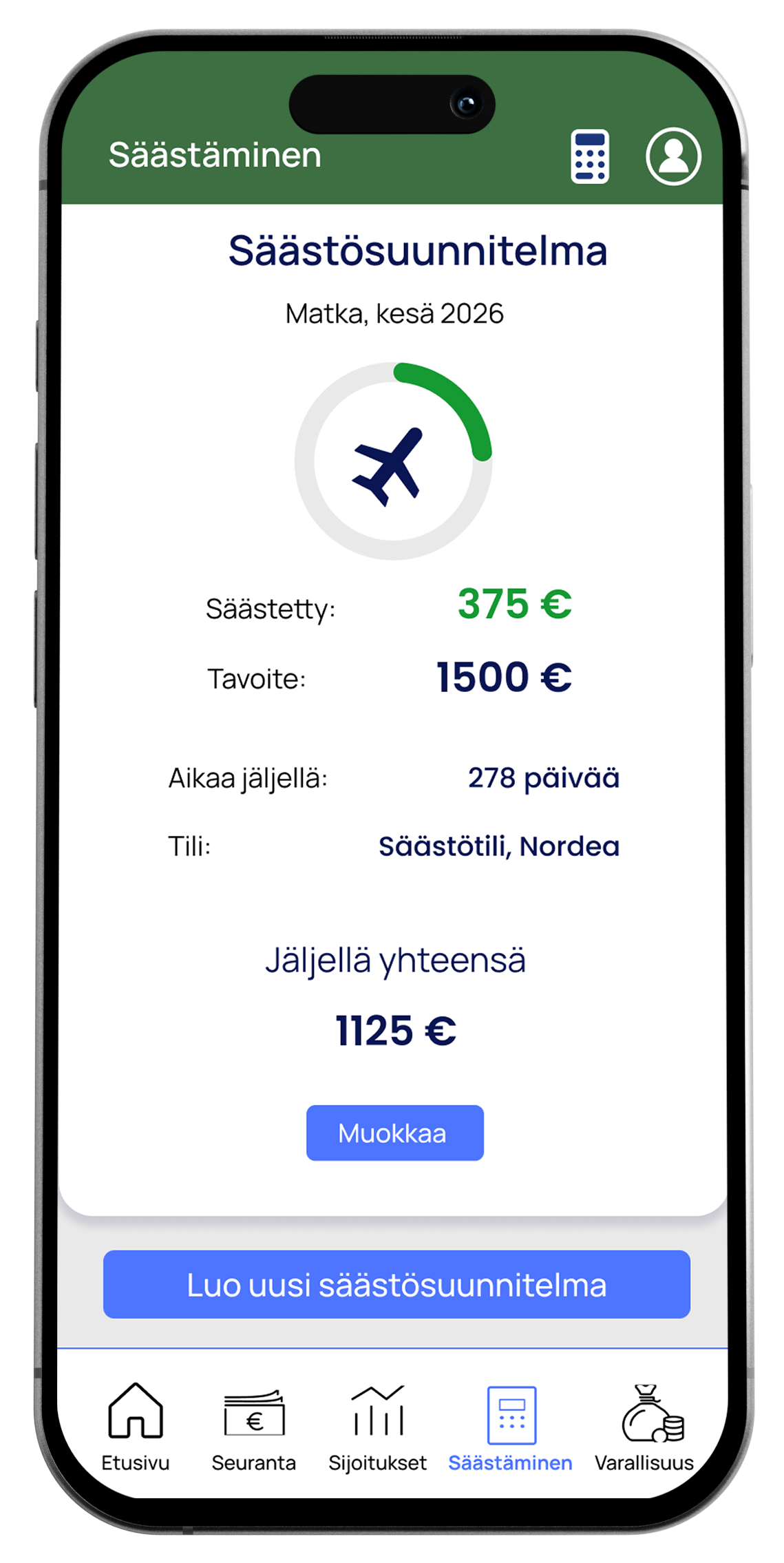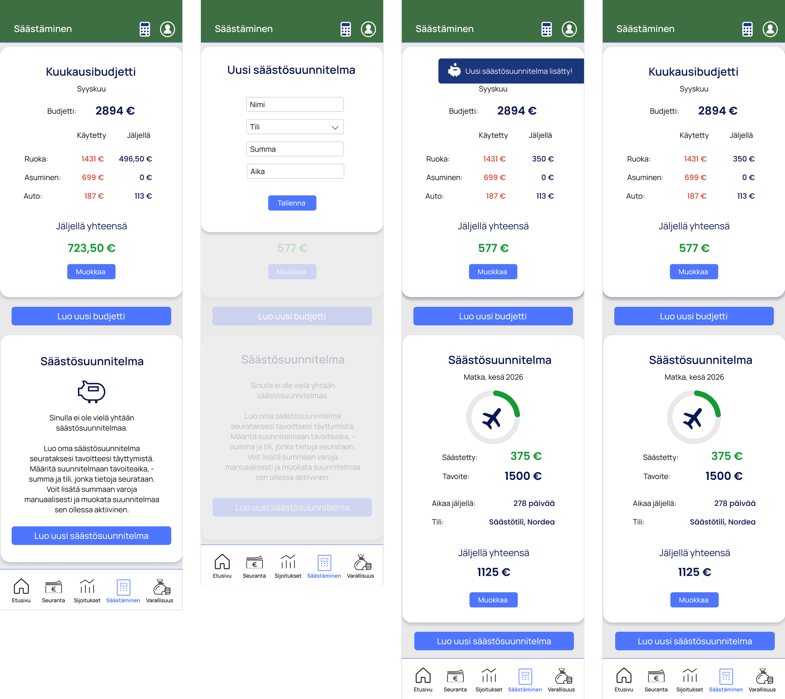 Rename "Budjetit" (Budgets) to "Säästäminen" (Saving) both on the bottom navigation bar and on the Budgets page.